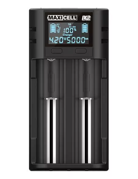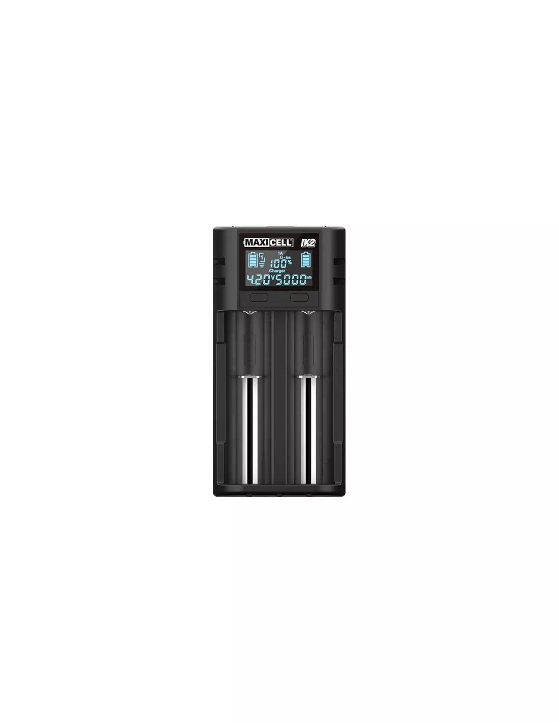 Cargador Inteligente IX2 - Maxicell con 2 slots, pantalla digital y carga segura para baterías Li-ion y Ni-MH. Entrada USB-C.