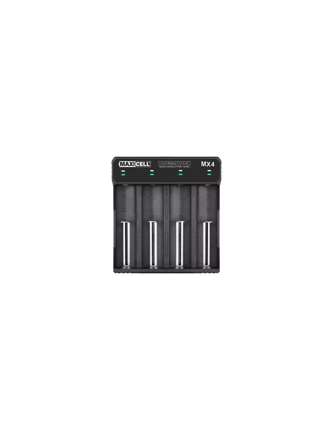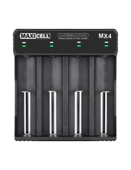 Cargador Rápido MX4 - Maxicell para 4 baterías Li-ion. Entrada USB-C, carga segura e independiente, ideal para mods y vapeo avanzado.